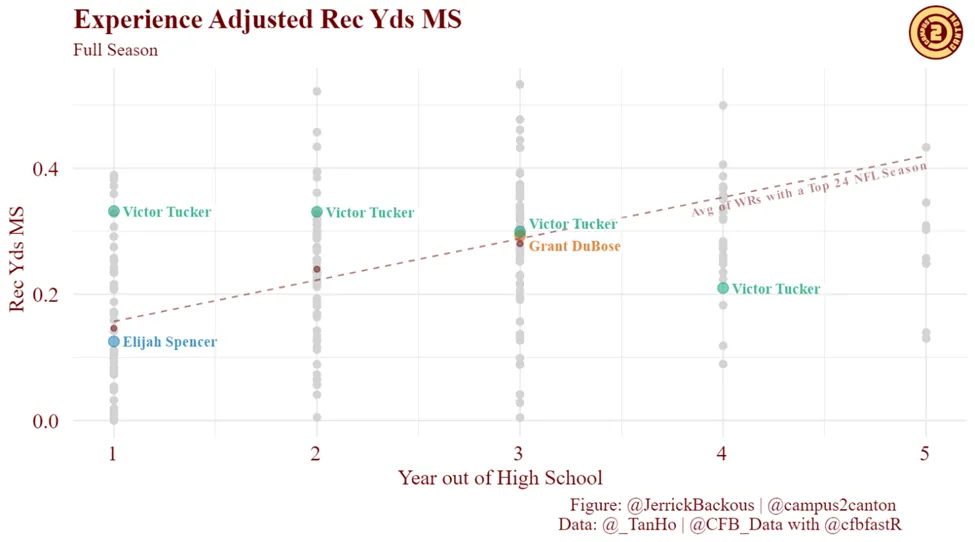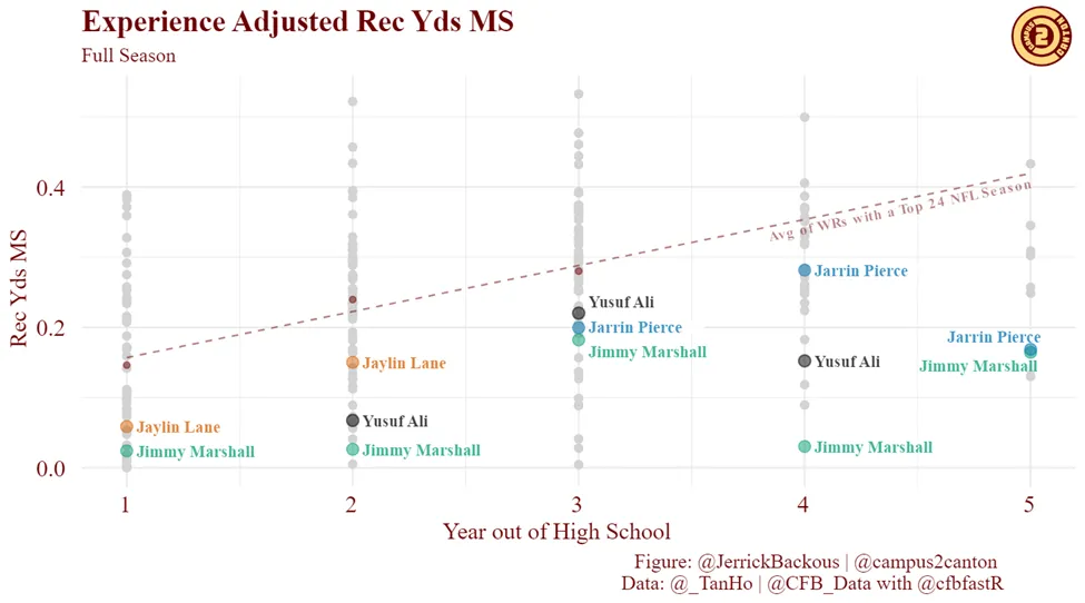 Knowing Cunningham has upside in quality matchups, that necessitates receiving production. My favorite target in this offense is receiver Jaylin Lane. Lane was fourth in receiving last year, but the top two targets, Jarrin Peirce and Jimmy Marshall leaving, vacate 33% of last yearβs receiving yardage production. He secured a 15% market share last season as a second-year player. Lane is a dynamic playmaker who is one of the countryβs best returners. Look for the offense to feature him more this year.