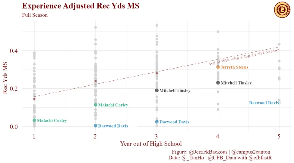 At receiver, we should see new faces leading this group. Both Jerreth Sterns and Mitchell Tinsley move on (Sterns to the NFL and Tinsley to Penn State), vacating 54.4% of receiving yardage production from last season β a total of 3,304 yards between the duos This opens plenty of production for Malachi Corley and Daewood Davis. Corley, the younger of the two as a third-year player, will move into a full-time starter role and look to expand on his 11.3% market share. He is generally the first drafted of the two and operates in a similar role to Sterns, making him a preferred target but donβt sleep on Davis.