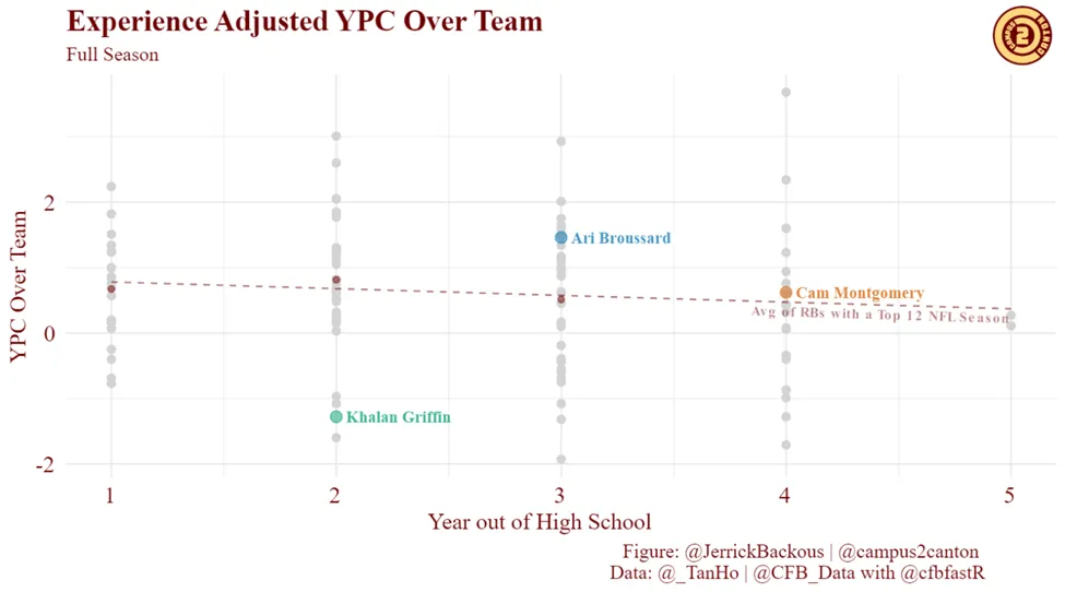 I think we do need to be rostering Ari Broussard, however. Thereβs a new offensive coordinator in town with Marques Tuiasosopo and a new quarterback under center in TJ McMahon. I think McMahon has a higher ceiling in this offense despite the limited sample size, highlighted by his 9.1 yards per pass attempt prior to his Rice transfer. Broussard has ample experience, and RB2 Dean Conners has yet to record a carry. This offense also vacates 51% of last yearβs rushing production between the losses of Jordan Meyers and Khalan Griffin. Without experience and vacated opportunity, itβs Broussardβs job, and thereβs 1,000-yard potential this year.