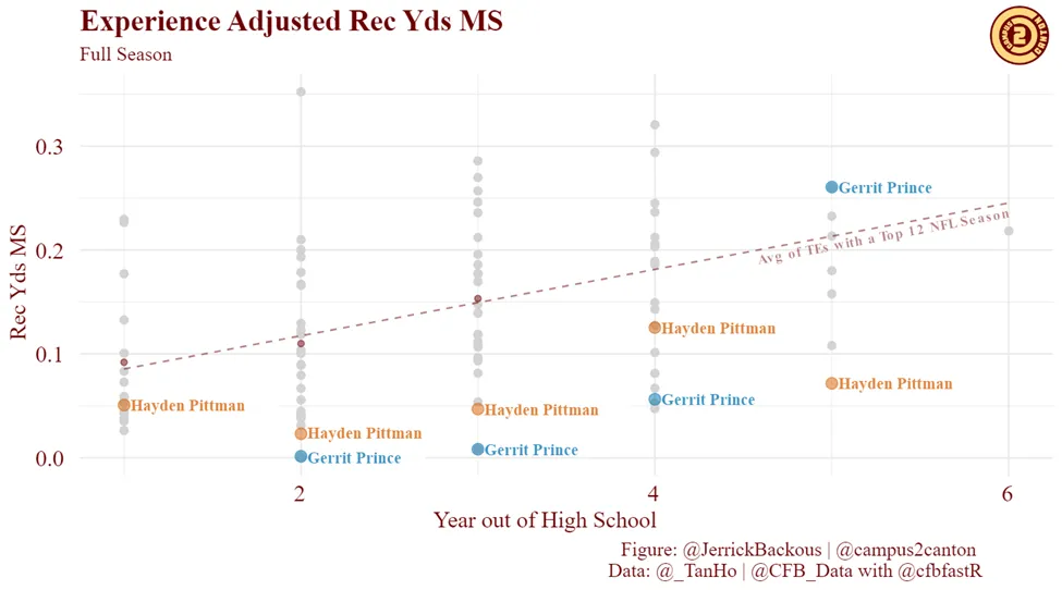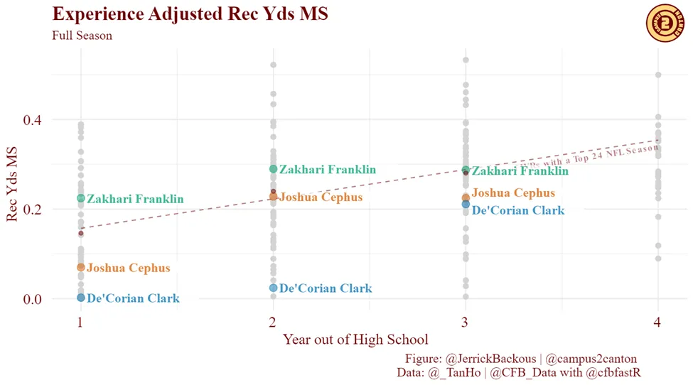 Harris returns his top three targets led by Zakhari Franklin. Franklin is one of the highest floor receivers in the country and should have another 1,000-yard season. Franklin has back-to-back seasons of 30% receiving yardage market share and leads a strong group. Alongside Franklin, Joshua Cephus should be a productive fantasy option. He is also competing with DeβCorian Clark for WR2 opportunity. Both are quality receivers and, in best ball, can have week-winning weeks as the rotating secondary option.