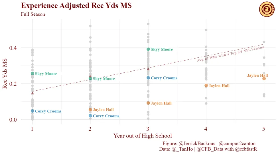 Despite a 96th-ranked neutral game script pass rate, the offense has been able to sustain receiving production the last two years. Between both Moore declaring for the draft and Jaylen Hall transferring to Western Kentucky, the two vacate 52% of offensive receiving production. In steps receiver Corey Crooms. Last year, Crooms secured a 23% receiving yardage share alongside Moore and Hall and is certainly the primary receiving option in 2022.
