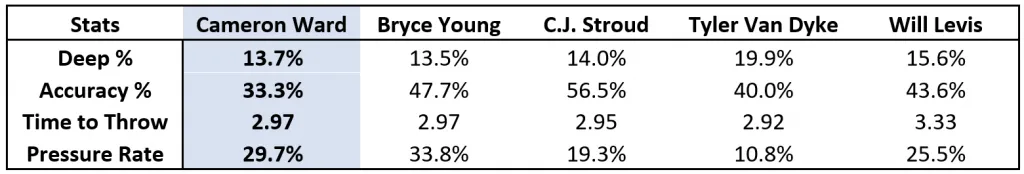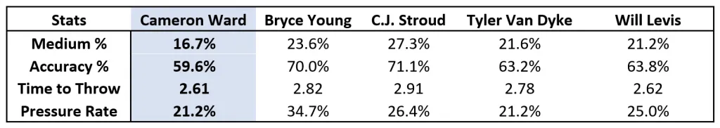Again, as a raw passer, there’s a willingness to let the deep passing inaccuracy slide. This is still a player who averaged under 12 pass attempts per game in high school. As we get closer to the line of scrimmage, the pass rate goes up and while Ward follows his trend, it still lags his peers. His intermediate (10-19 yards) accuracy percentage improves, ranked 66th of 112 players. He’s still in the lower half. However, of the QBs in our sample, Ward has clearly had the least time to throw, lending credence to the idea that his surrounding cast was subpar at best. His 21% pressure rate on intermediate throws ranks substantially better, 88th of 112. The time to throw is suspect, meaning he’s likely scrambling at that point despite a relatively low-pressure rate.