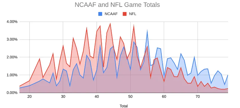 One thing is true. Defense is played at a lower level in college football. Games are substantially higher scoring, with totals often approaching the upper 60s and 70s. The most common FBS game total is 55 points, compared to the NFL’s 44. On average, college games score almost 10 points (9.6) more than NFL games, and given that, it makes the variance even greater.
