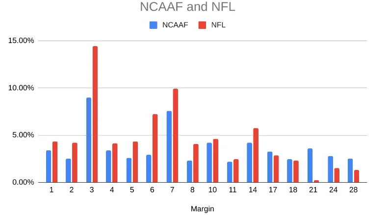 These results, to someone who bets NFL exclusively, might be shocking. 24.3% of NFL games are decided by 3 or 7, while only 16% of college football games fall within the same margins. A 9% difference between the two key numbers, with a 6%+ difference between 3, the keyest of key numbers.