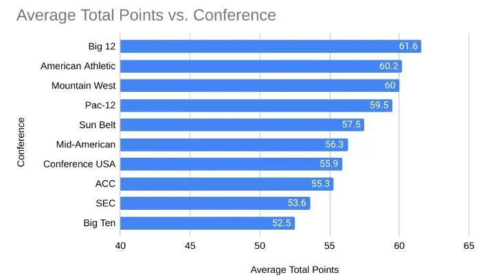 The top 20 most common game totals account for 47.1% of the overall number of college football finishes. In the NFL, that number is 60.0%. A 13% difference between these two, emphasizing a couple of different factors. First, there is substantial variation by conference. Using this study done by PFF in 2021, it’s easy to identify which conferences score more on average.