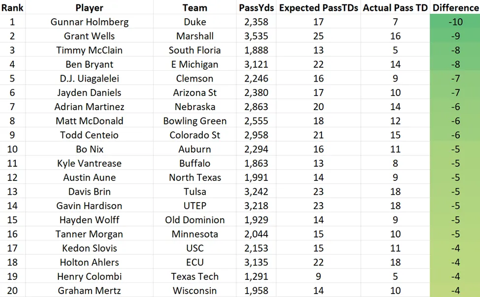 An interesting note from the list above is that eight of the top 20 underperforming quarterbacks in touchdowns transferred this year. I openly wonder if thatβs a coincidence but β is there something there with the quarterbackβs not living up to expectations statistically and being run out of town? Evaluating this group becomes more difficult in new situations but I think thereβs reason to think we see more production from this group.