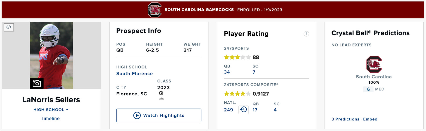 The most dedicated readers should know by now that Iβm always partial to late-rising prospects. Sellers had quite a climb throughout his senior year, starting with a mid-0.8s rating on 247βs composite score and finishing with a rating above 0.9, which would have meant he climbed up several hundred spots on the player rating database. He originally committed to play in the ACC with Syracuse but flipped his commitment to South Carolina later in the cycle.Β
